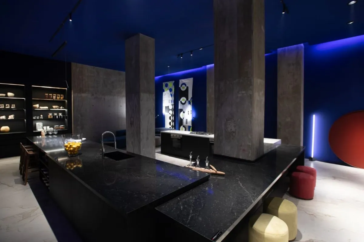 Asimismo, presenta el “Azul Puro™” como color tendencia para el año entrante. Este azul vibrante puede encontrarse como protagonista en este espacio y en otros, como por ejemplo, la cocina de encuentro de las arquitectas María Beatriz González Zuelgaray y Beatriz Palacios. En términos generales, el azul es un tono que provoca sensación de estabilidad, fluidez e inmensidad, el remedio para la vida frenética actual. Es también, aparentemente, el color favorito del mundo, por su conexión con el cielo sin nubes y las aguas relucientes. Un color asociado a la frescura, a la limpieza y a la calma.