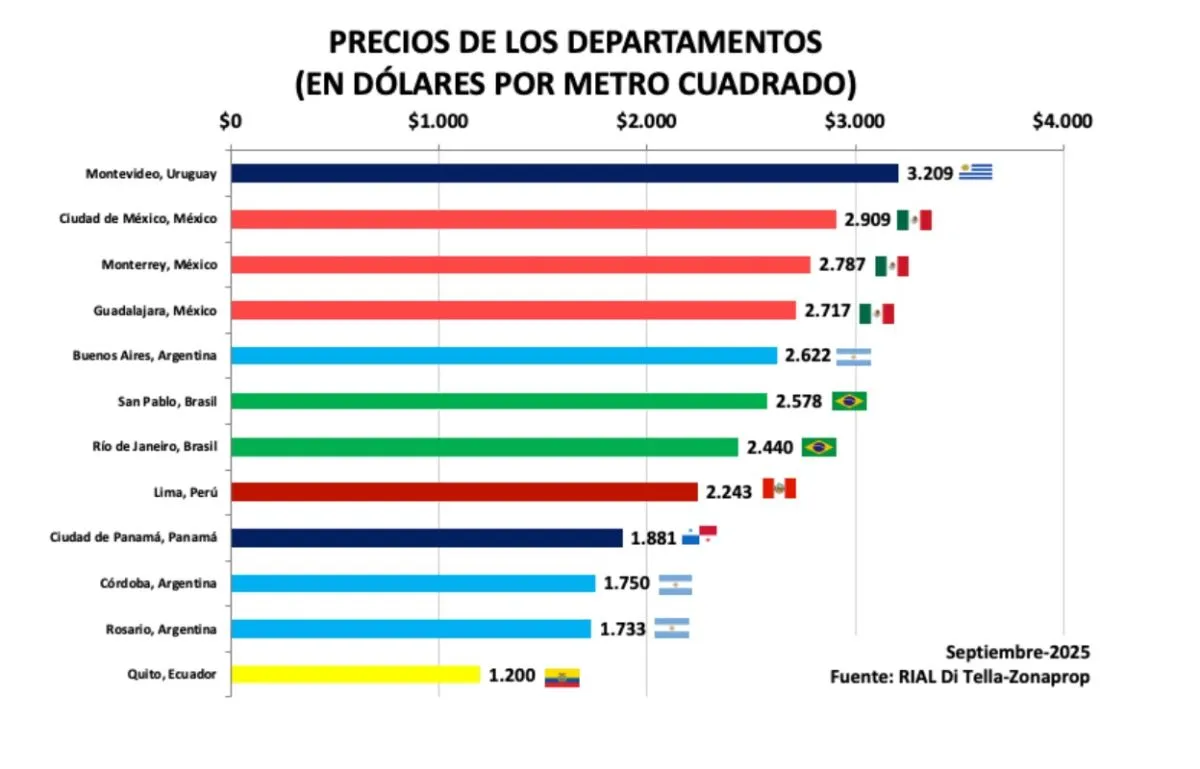 Según el relevamiento, las ciudades con el metro cuadrado más caro de la región son Montevideo (3.209 dólares), Ciudad de México (2.909 dólares), Monterrey (2.787 dólares), Guadalajara (2.717 dólares/m2) y Buenos Aires (2.622 dólares/m2). Por el contrario, las ciudades con el metro cuadrado más accesible son Quito (1.200 dólares), Rosario (1.733 dólares), Córdoba (1.750 dólares)  y Panamá (1.881 dólares).