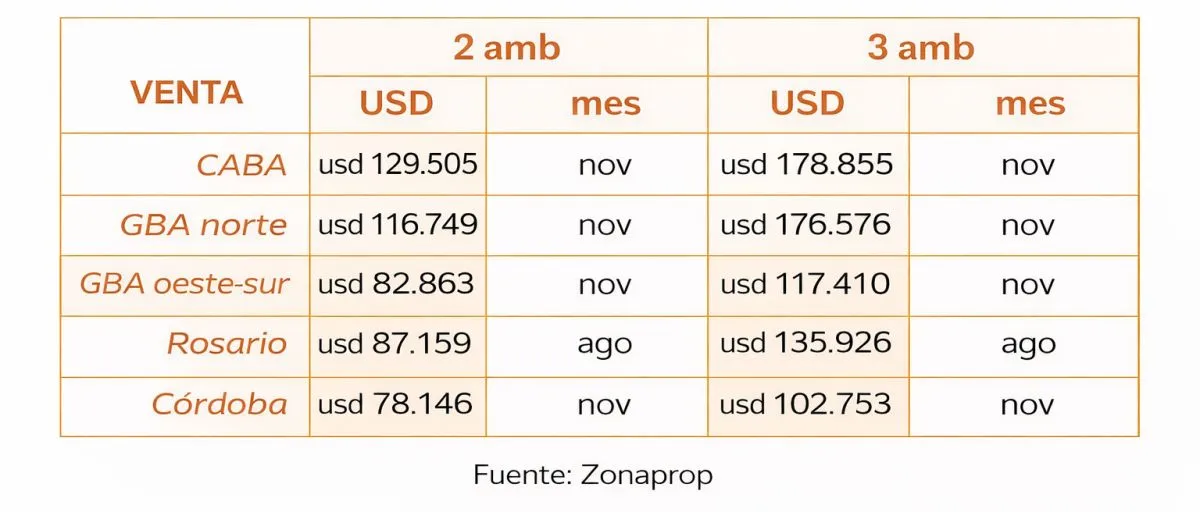 El informe también analiza los valores según la cantidad de ambientes y allí aparecen diferencias significativas entre regiones. En GBA norte, el salto de precio entre un departamento de dos y uno de tres ambientes es el más marcado del país, con una diferencia cercana a los 60 mil dólares. De hecho, un departamento de dos ambientes en esa zona, con un valor promedio de 116.749 dólares, cuesta prácticamente lo mismo que un tres ambientes en GBA oeste-sur, cuyo precio ronda los 117.410 dólares.