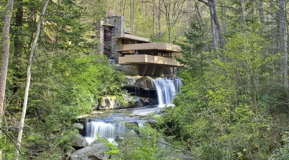 Construida en Pensilvania, Estados Unidos, en 1935, la casa se integra con el paisaje de manera radical: fue diseñada directamente sobre una cascada. Las terrazas de hormigón se proyectan en voladizo sobre el agua, creando la sensación de que la vivienda flota sobre el paisaje natural.