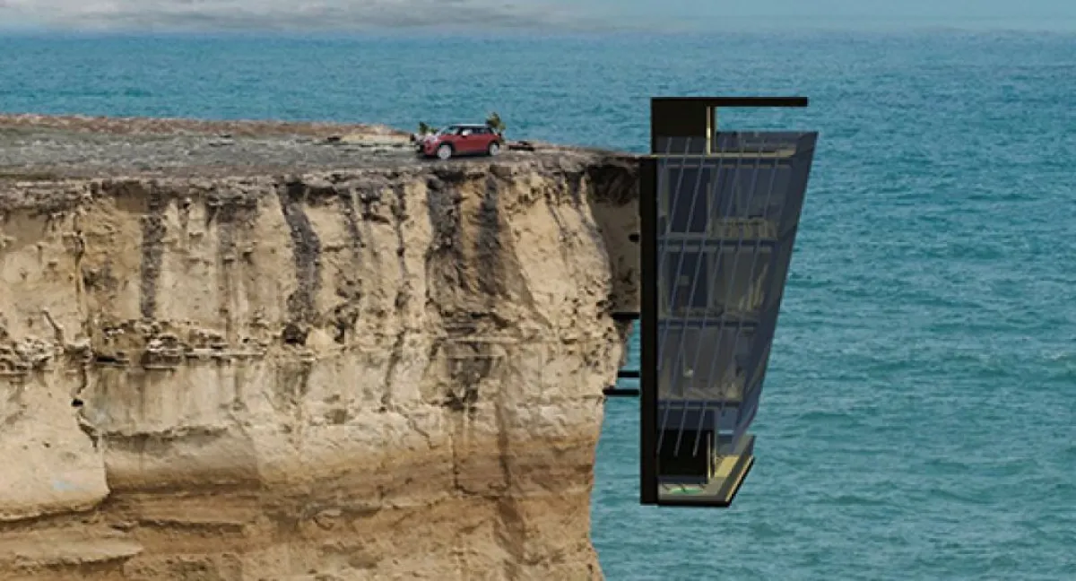 En la costa de Australia, el concepto de vivienda suspendida en un acantilado desarrollado por Modscape plantea un sistema modular anclado directamente a la roca.