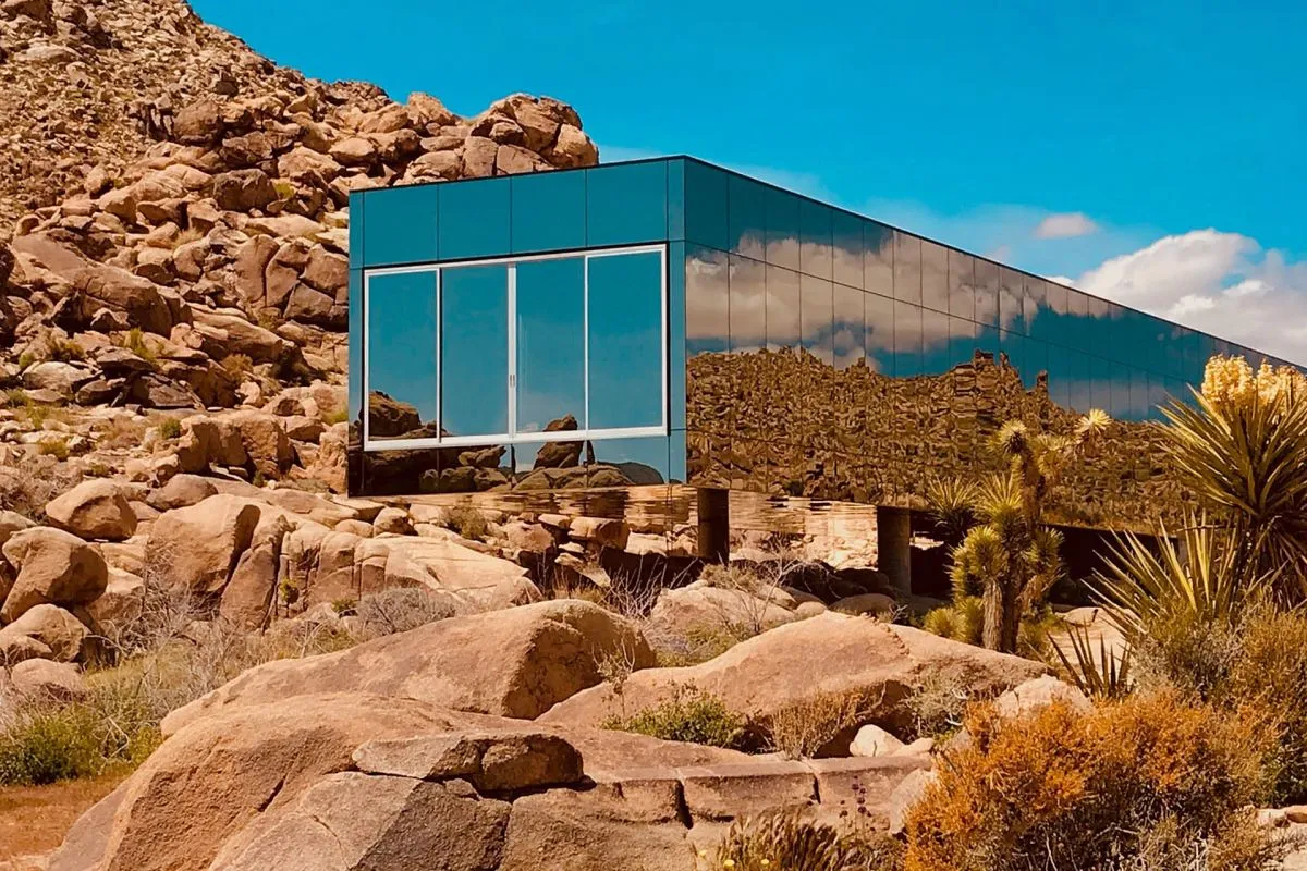 El caso de la llamada casa espejo en Estados Unidos, diseñada por Joshua Tree Invisible House designers Chris Hanley and Tomas Osinski. Su envolvente de vidrio espejado refleja completamente el paisaje desértico, generando un efecto de invisibilidad.