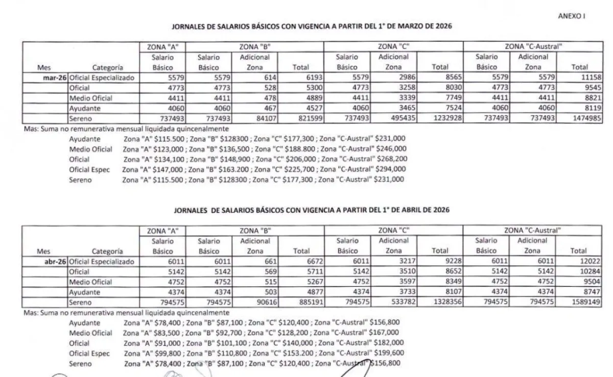 Además de las subas en los básicos, se estableció el pago de sumas mensuales no remunerativas para todas las categorías. En la Zona A, los montos fijados para marzo van desde 115.500 pesos para ayudantes y serenos hasta 147.000 pesos para oficiales especializados.